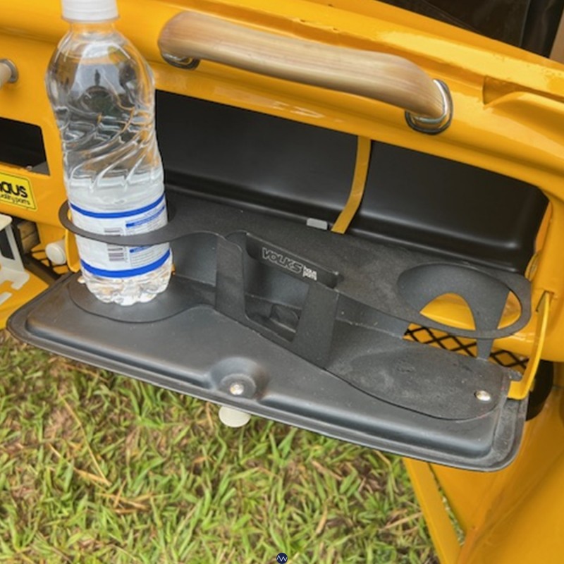 En tant que conducteur de Coccinelle, nous avons tous une technique plus ou moins hasardeuse pour ranger nos smartphones et autres boissons, sur le cendrier, dans la boîte à gants ou encore entre les sièges, cela se termine souvent par une chute au premier virage ! Ce support se fixe à l'intérieur de la trappe de boîte à gants. Il est conçu pour accueillir deux boissons et un téléphone.